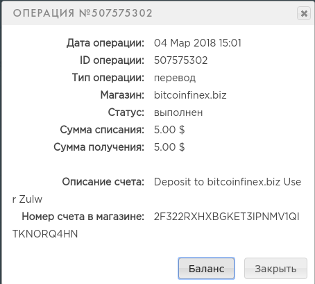 BOJIKOBI4 Posted 4 Mar 2018, 15:51 Author Posted 4 Mar 2018, 15:51 Bonus $ 4.00 Mar-4-2018 10:28:31 AM Bonus note for 2 forum Received Payment 4.00 USD from account U16774202 to account U15933823. Batch: 207335558. Memo: API Payment. Withdraw to bojikobi4 from bitcoinfinex.biz. + 1.48 USD Date: 04.03.2018 18:45:54ID: 507773673Details: P70440878 → P24272615Amount: 1.48 USDComment: Withdraw to bojikobi4 from bitcoinfinex.biz